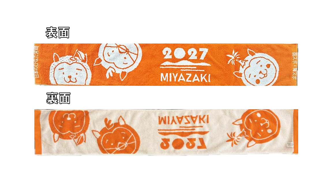 大会マスコットキャラクター「みやざき犬」がプリントされたマフラータオルです。綿100%のジャガード織は肌触りがよく、保温性・吸水性ともに抜群です。