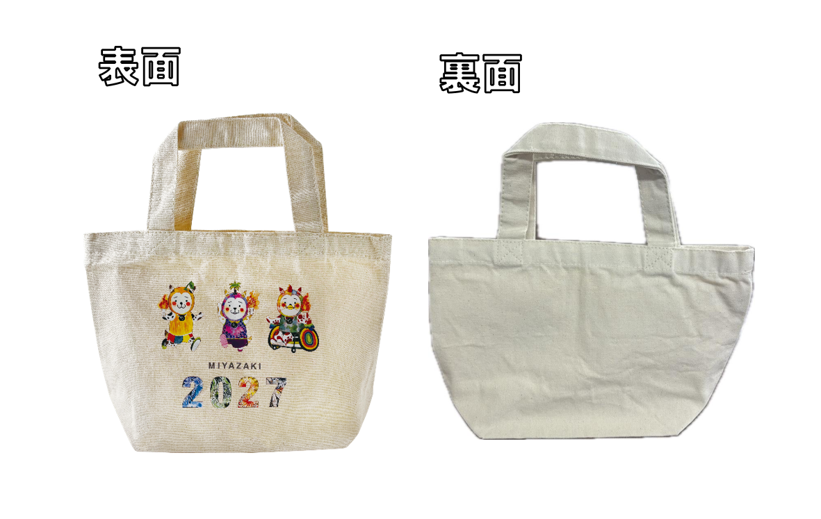 宮崎市在住のイラスト作家「あーちゃん」さんに大会マスコットキャラクター「みやざき犬」を描いてもらいました。お弁当箱入れやちょっとしたお出かけなど日常使いしやすいバッグです。